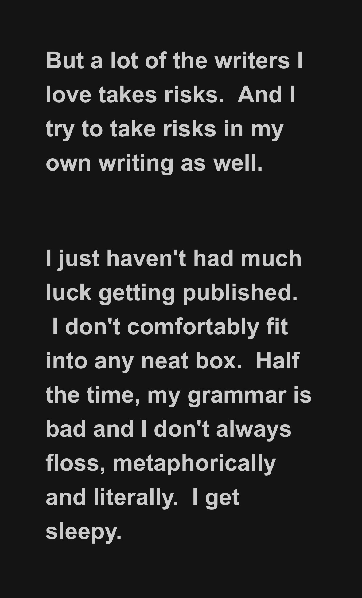 I waited months while my contributor copy made its slow journey to the bottom of the world. And I remember opening the package and holding it in my hands and feeling this deep sense of…well, not disappointment exactly, but realisation. The writing inside was wonderful. The journal was doing exactly what it set out to do: publish excellent literary work, affordably, at scale, backed by institutional funding. That’s a model that has sustained literary publishing for decades.